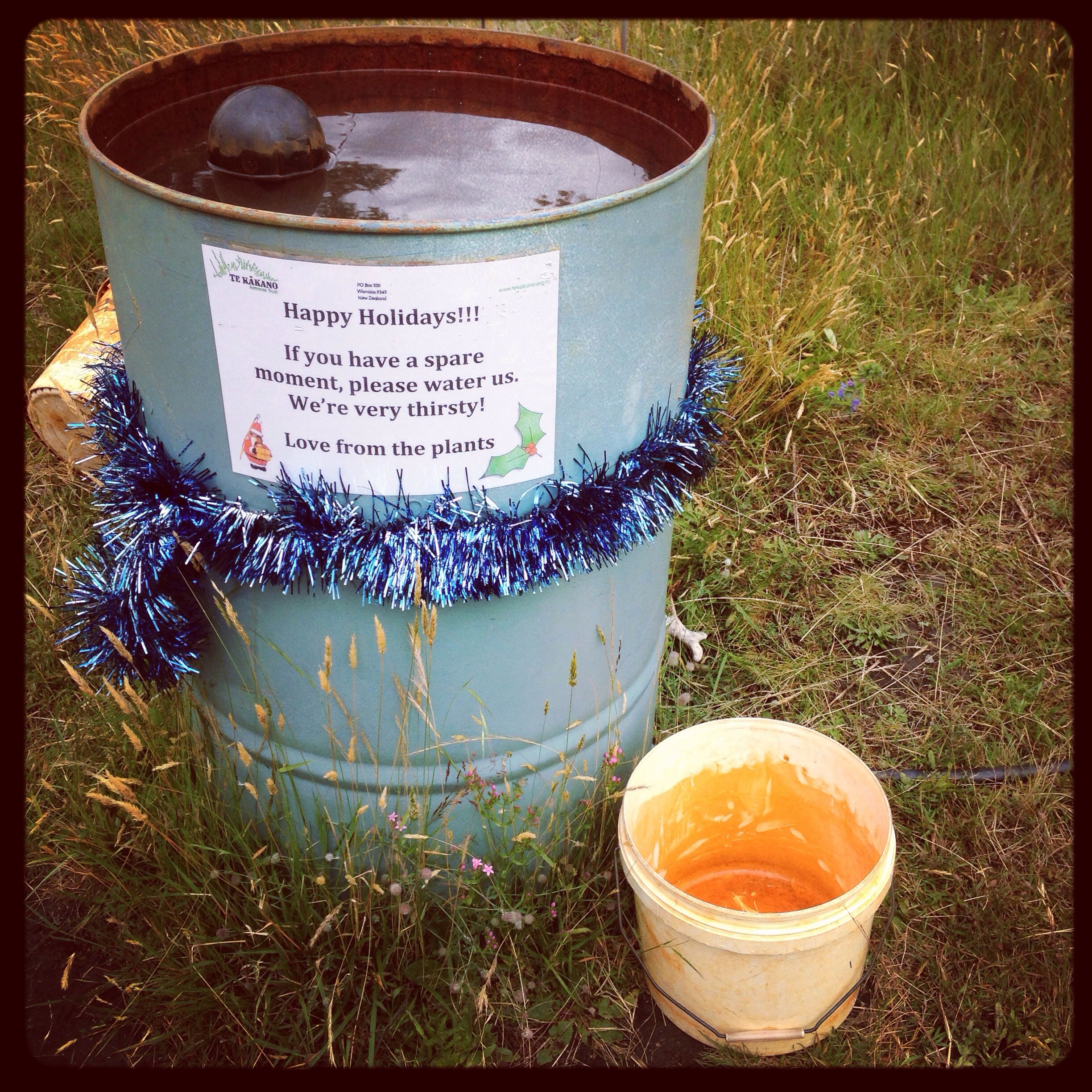 We discovered a stand of kanuka that is indigenous to the area plus an area of new plantings of natives that were all set up with a bin of water, buckets and signs asking passers by to water them. So that’s what we did.