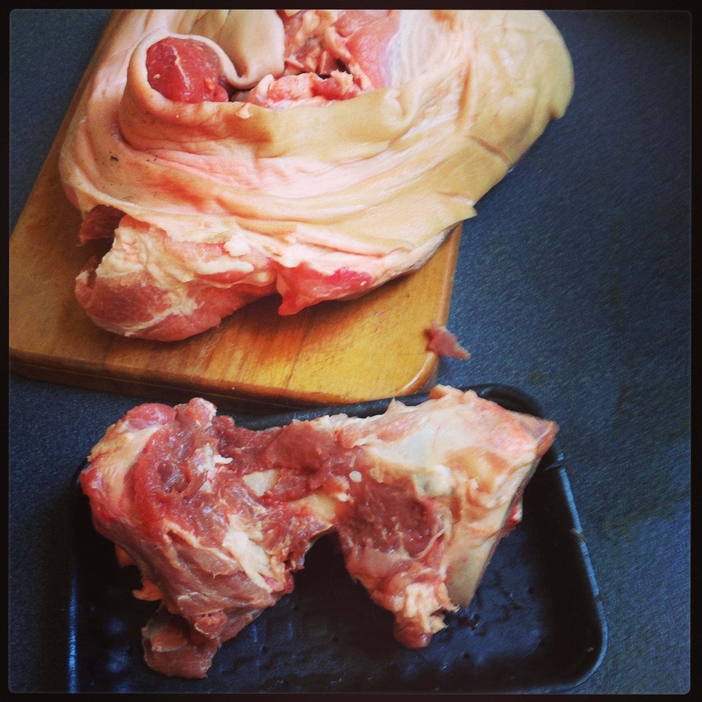 Tonight I gave pork shoulder a go. Google Chef advised to get one without the bone. Mine had a bone (whoops) and I took some time dissecting the meat from the bone. I was quite proud once it was done.