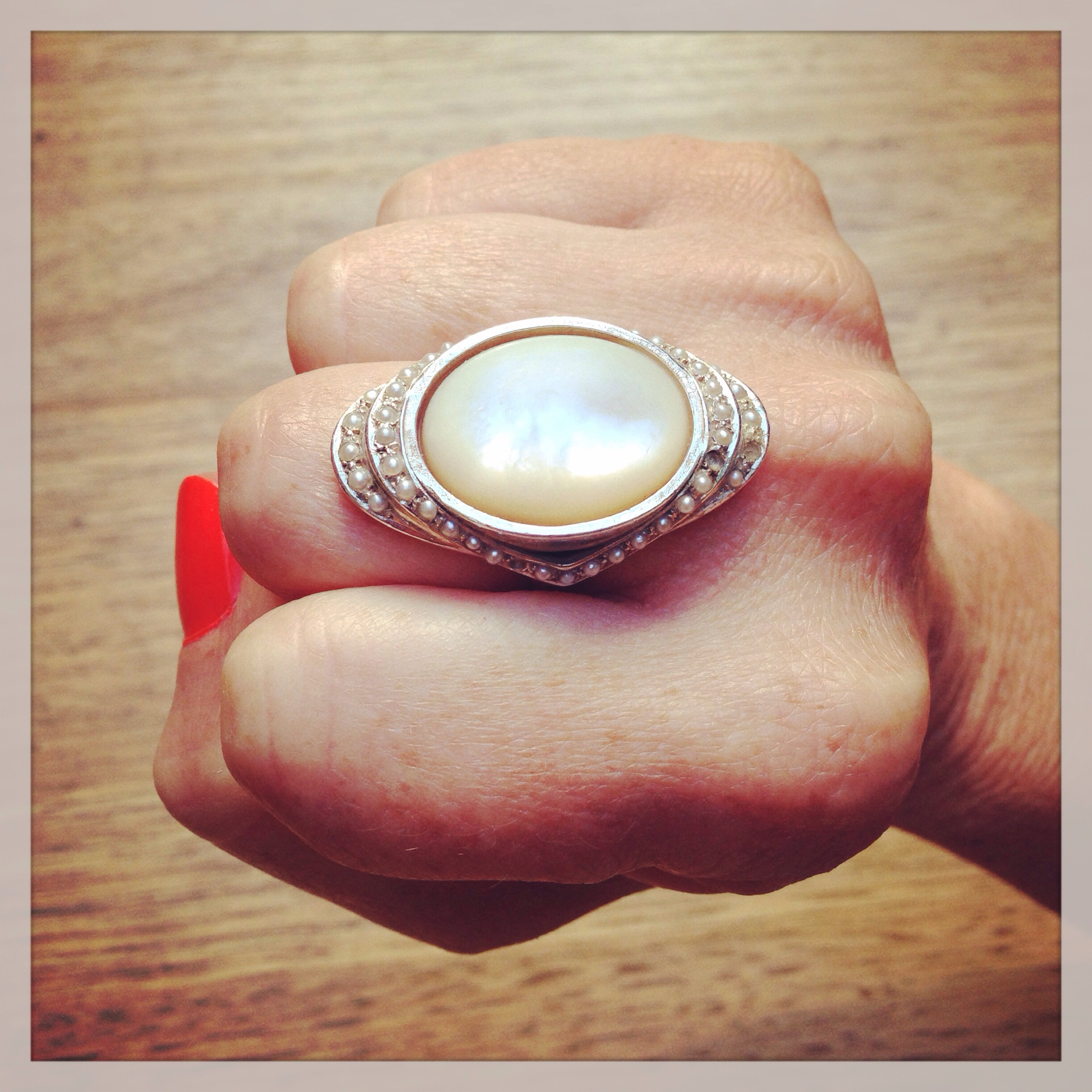 I have a particular attraction to mother-of-pearl. The dream-like colours are hypnotic. Years ago I found a mother-of-pearl ring in my local Salvation Army thrift store. The shell was a large pure smooth oval but the setting was hideous. Think cheap nasty tres 1960’s lump of silver coloured metal but not silver. So last year I took the ring to TORY & KO for remodeling. We took inspiration from an original 1930’s marcasite ring of mine and a few weeks later my inbox had a sketch of the perfect deco design featuring borders of seed pearls.