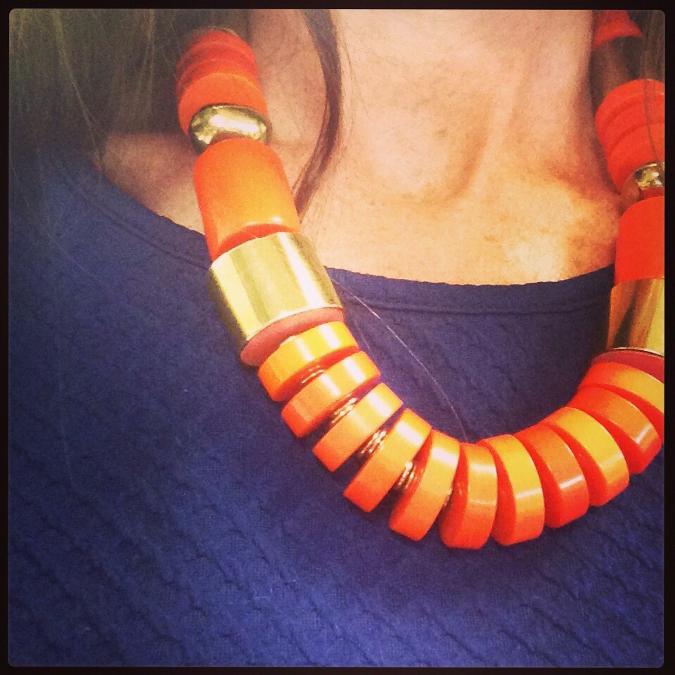 Today I engaged in a wardrobe re:boot by wearing an old orange skirt with a fantastic new navy peplum top. I finished the look with navy suede wedges & this hot orange & gold statement necklace.