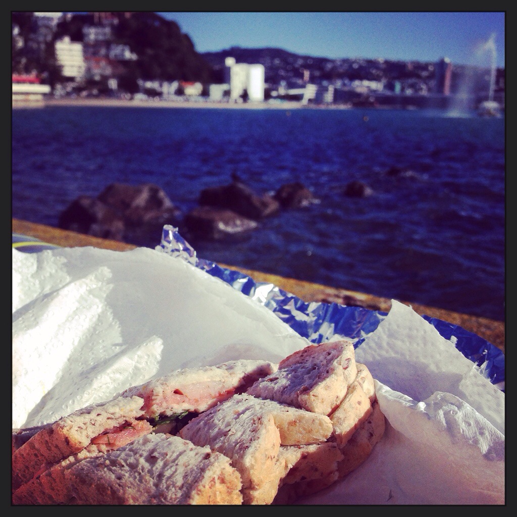 We drive to Oriental Parade. Sat in the sun and are and laughed. She lent me her new Kathmandu puffer jacket that looks like a sleeping bag with style (I had forgotten my coat) (I know I know – what was I thinking?!) and we sat on a picnic blanket sipping lemonade and nibbling sandwiches.